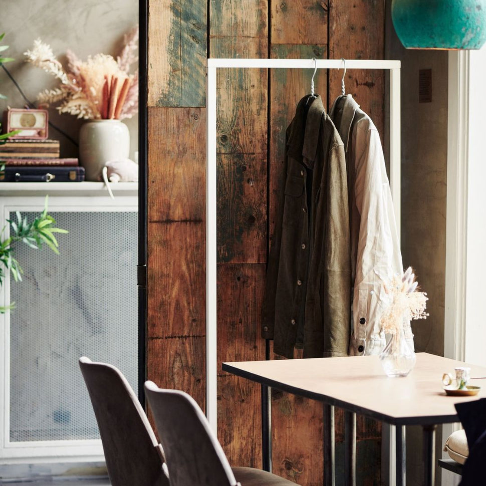 Minimalistisk design: Det hvide tøjstativ er en hyldest til de skandinaviske designprincipper, hvor enkelhed møder funktionalitet.
