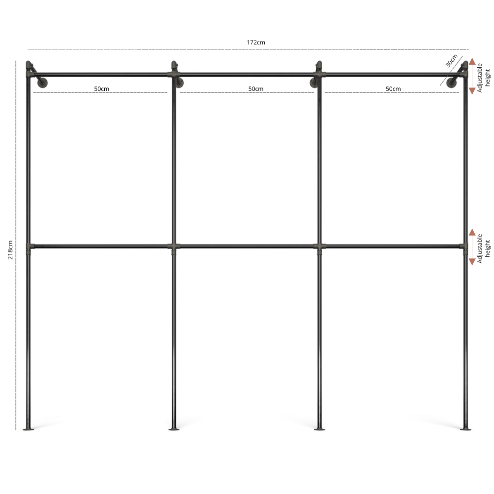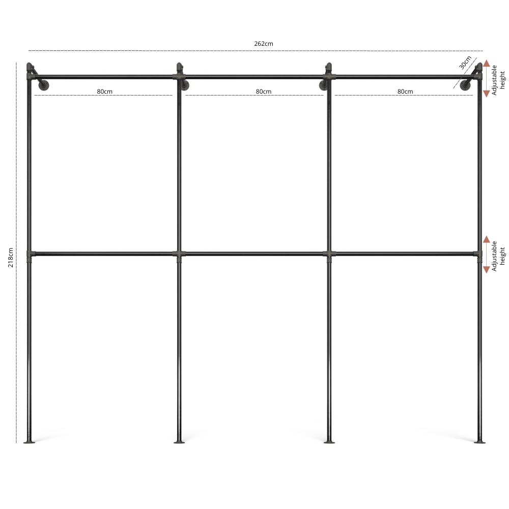 Bredde: Bredden afhænger af, hvilken variant du vælger. Du kan vælge mellem forskellige sektioner på hhv. 50, 80 eller 120cm. Vær opmærksom på, at tallene afspejler inder mål i sektionerne, altså bøjlestang, hylder eller kommodemål. De inkludere altså ikke de lodrette rør, som hver fylder 5 cm. e ca. 260 cm.