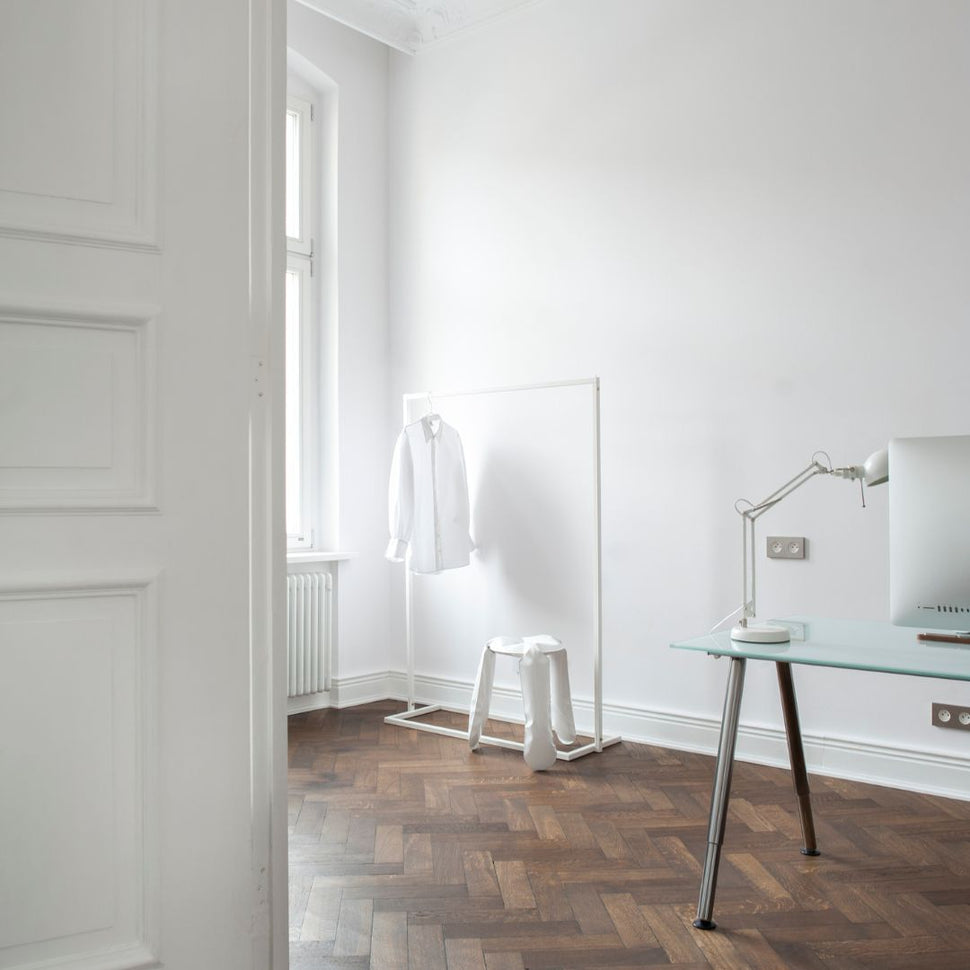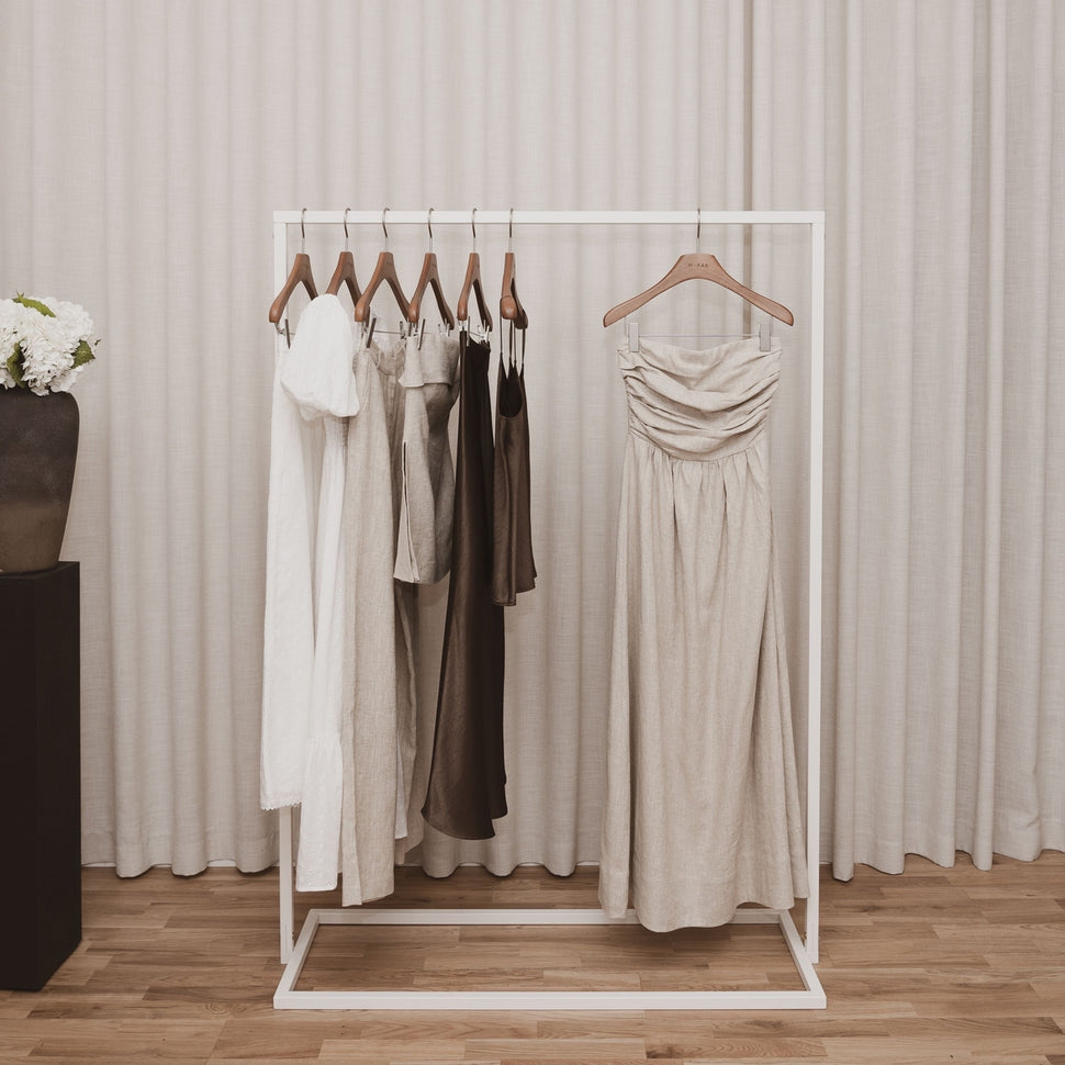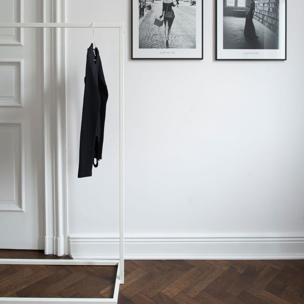 Vores Frame Georgia - Hvidt tøjstativ med industriel, firkantet bund er skabt med nøje udvalgte materialer, der sikrer en balance mellem letvægtsdesign og høj robusthed. Denne opbevaringsløsning er ideel til dem, der søger en fleksibel og stilren løsning til deres hjem: