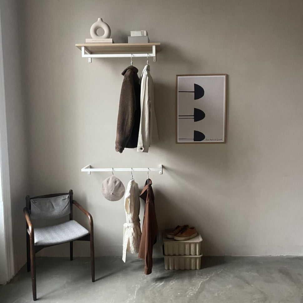 Med et bredde på 80 cm og en dybde på 30 cm er Frame Joey - Vægmonteret tøjstativ den ideelle løsning til at optimere din opbevaringsplads uden at gå på kompromis med designet. Vores tøjstativ er designet til at bære al den vægt, du har brug for – perfekt til alt, hvad du ønsker at hænge op. Den medfølgende installationspakke sikrer, at du nemt og hurtigt får sat systemet op på væggen.