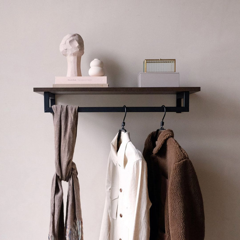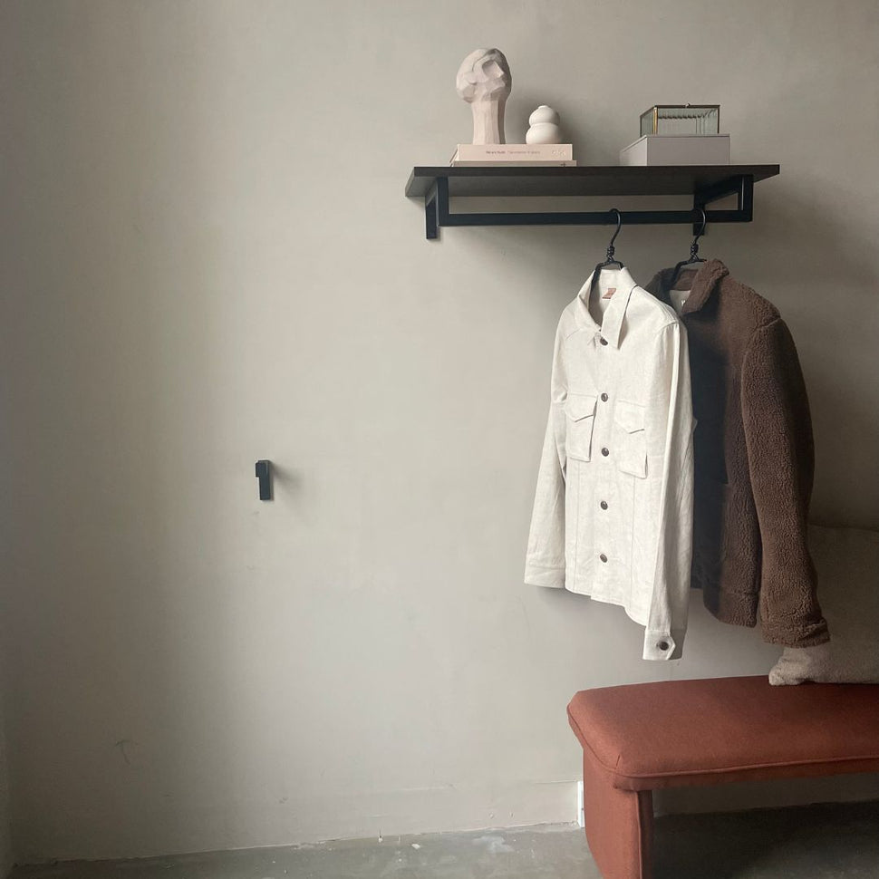 Vi forstår, at du drømmer om et hjem, hvor orden og stil går hånd i hånd. Derfor præsenterer vi stolt Frame Marlow - Vægmonteret tøjstativ med hylde. Denne løsning kombinerer et elegant design med funktionelle egenskaber, så du får en platform, der både optimerer pladsen og understøtter din personlige indretning – uanset om du indretter et walk-in closet, en tøjbutik eller en entré.