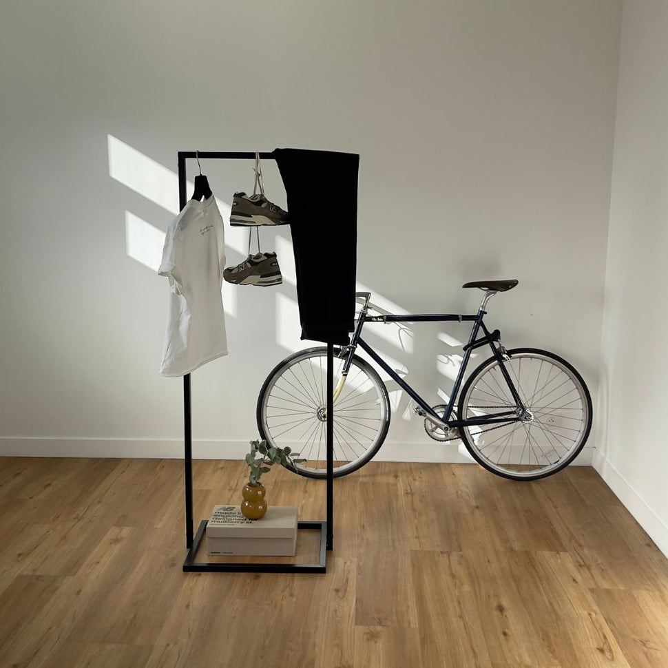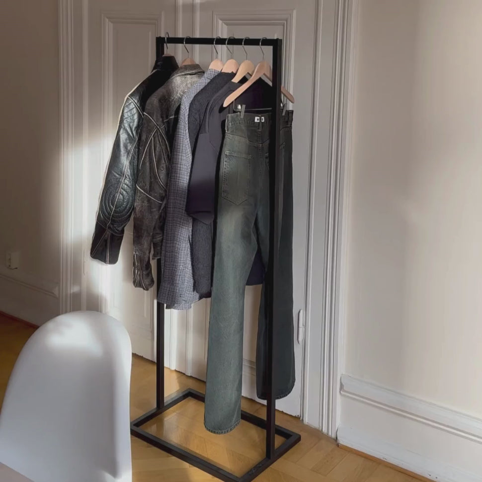 Er du træt af en begrænset plads og rodet tøj? Vi hos RackBuddy forstår kampen mod trange rum – og vi strækker grænserne for, hvad der er muligt. Derfor præsenterer vi stolt Frame Little Jackson - Sort tøjstativ med en firkantet bund. Denne del af vores populære Frame Collection kombinerer robust svejset jern med et minimalistisk udtryk, der optimerer din opbevaringsplads uden at fylde dit hjem.