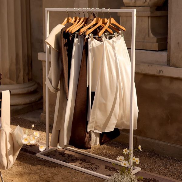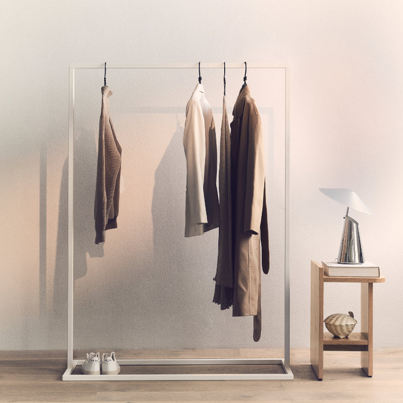 Vores Frame Georgia - Hvidt tøjstativ med industriel, firkantet bund er skabt med nøje udvalgte materialer, der sikrer en balance mellem letvægtsdesign og høj robusthed. Denne opbevaringsløsning er ideel til dem, der søger en fleksibel og stilren løsning til deres hjem: