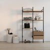 Regalsystem aus schwarzen, quadratischen Eisenrohren mit vier Regalen, Schreibtisch und Kommode aus klassischer Eiche