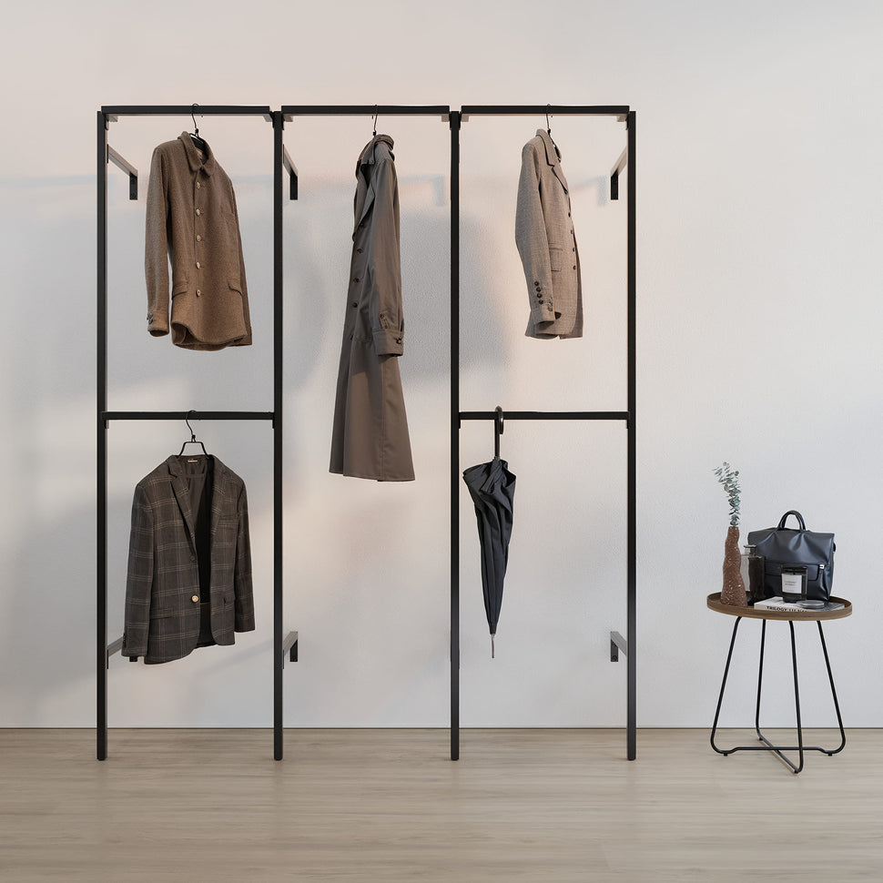 Tidløst design og kvalitet: Vores garderobesystem er pulverlakeret i sort og fremstillet af robuste materialer, der sikrer en lang levetid og en vedvarende æstetik.