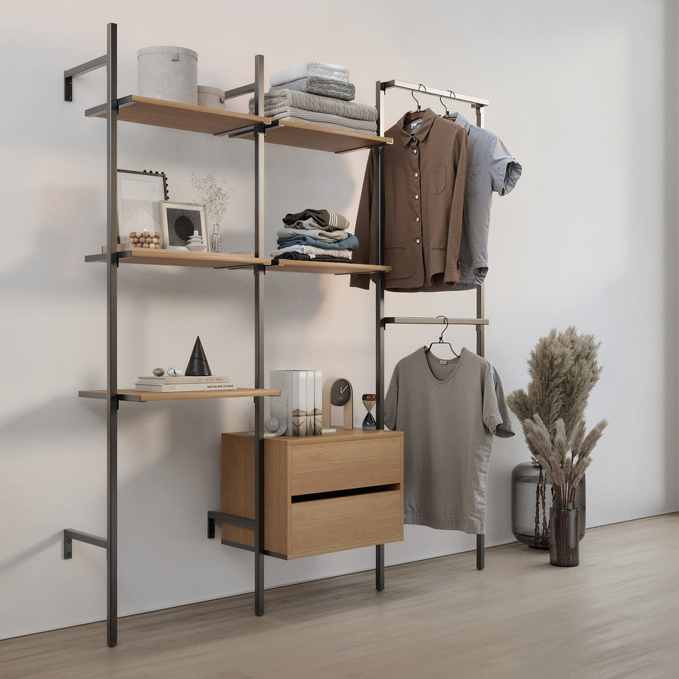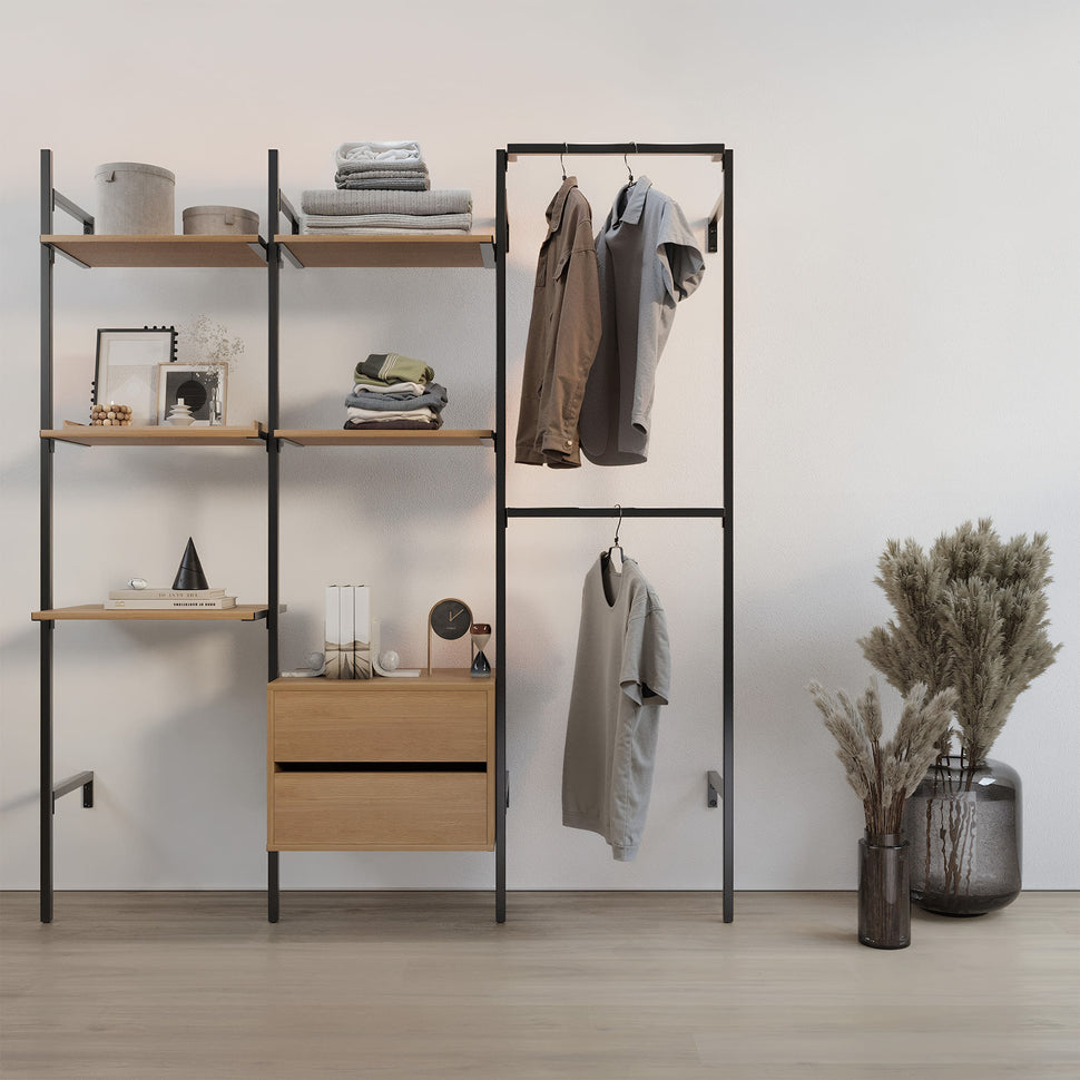Alsidige kombinationer: Vælg mellem (2 hylder + 1 skrivebord), (2 hylder + 1 kommode) eller (2 bøjlestænger) for at tilpasse løsningen præcis efter dine behov.