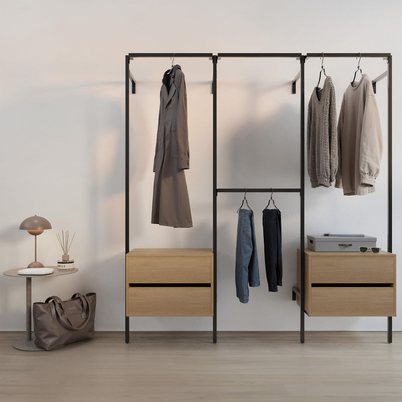 Vores Frame Walk-In løsning er ikke blot en opbevaringsløsning, men et designstatement. Den sorte pulverlakerede ramme og de elegante kommoder i klassisk eller røget egefinér skaber et moderne, men varmt udtryk, der passer perfekt ind i ethvert hjem. Med en højde på 195 cm og en total dybde på 42 cm (inklusive kommode) får du en garderobe, der både er rummelig og overskuelig.