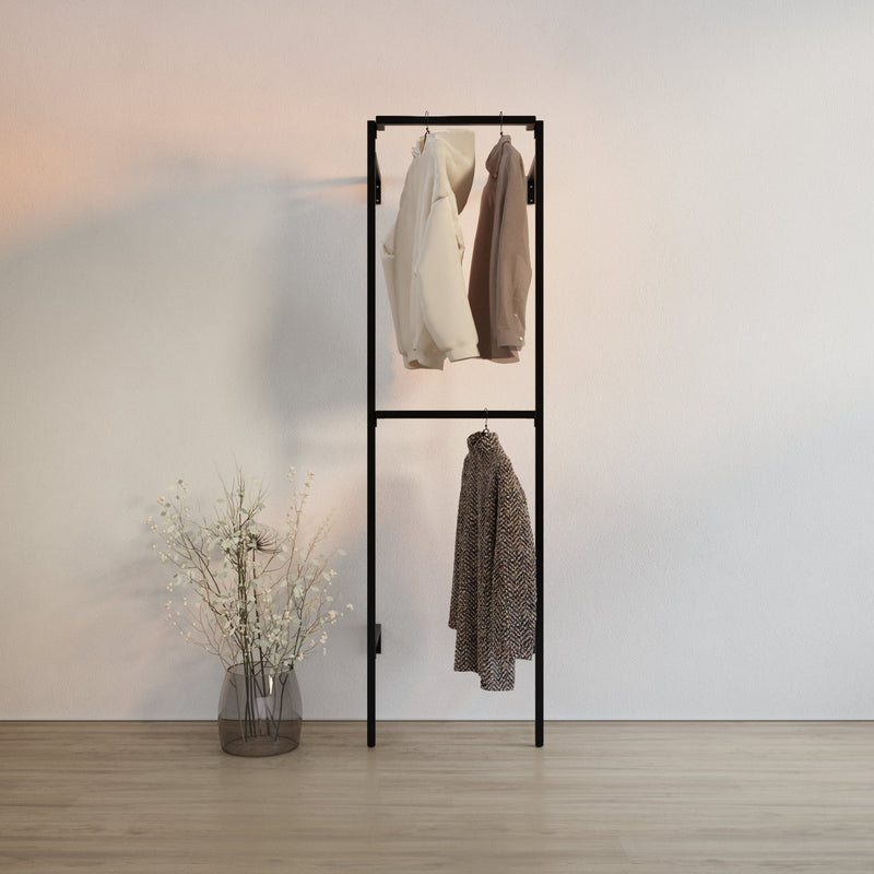 Med vores Frame Walk-In 1-række garderobesystem - (2 bøjlestænger) får du et tidløst design, der nemt integrerer i ethvert hjem. Vi bruger robuste materialer, som ikke kun leverer en holdbar løsning, men også et let og stilrent udtryk. Højdejusterbare bøjlestænger sikrer, at du tilpasser systemet til dine specifikke behov. Vores sort pulverlakering giver et elegant og moderne udtryk, der kendetegner skandinavisk æstetik.
