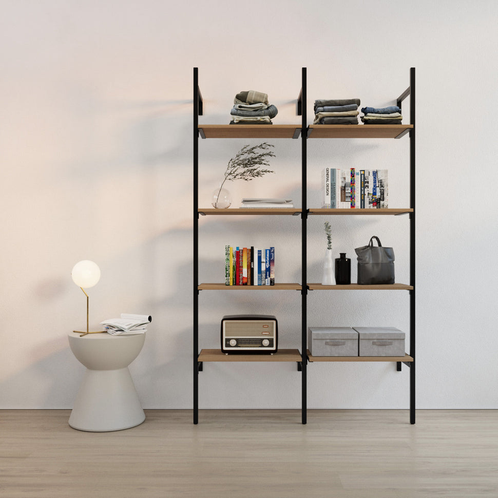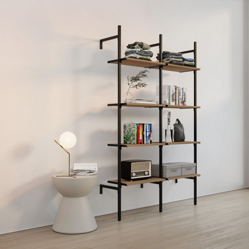 To rækker med 4 hylder: Justerbare hylder i elegant mørk eller lys fyr, klassisk egetræsfinér eller eksklusiv røget egetræsfinér – designet til at tilpasse sig dine behov.