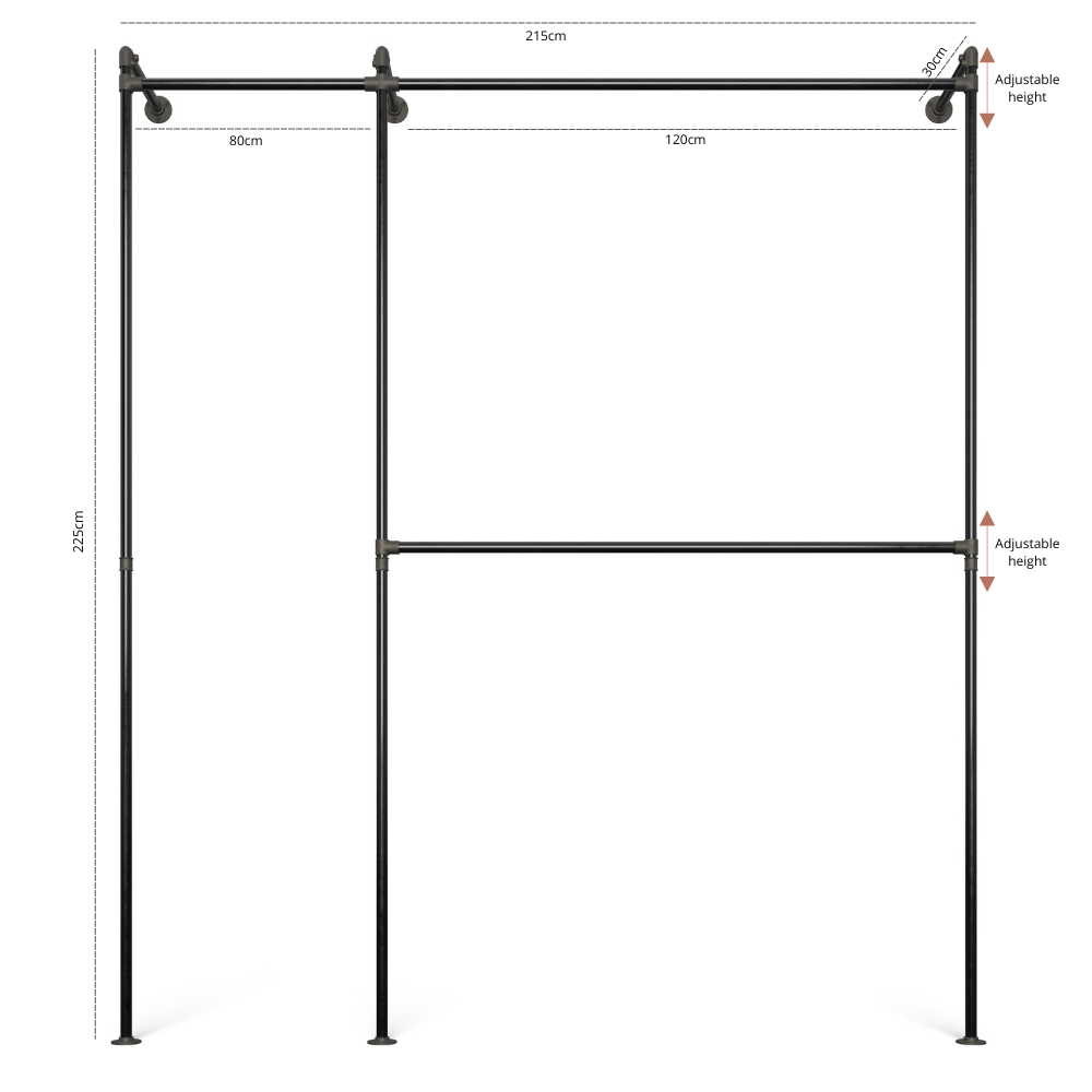 Bredde: Bredden afhænger af, hvilken variant du vælger. Du kan vælge mellem forskellige sektioner på hhv. 50, 80 eller 120cm. Vær opmærksom på, at tallene afspejler inder mål i sektionerne, altså bøjlestang, hylder eller kommodemål. De inkludere altså ikke de lodrette rør, som hver fylder 5 cm.