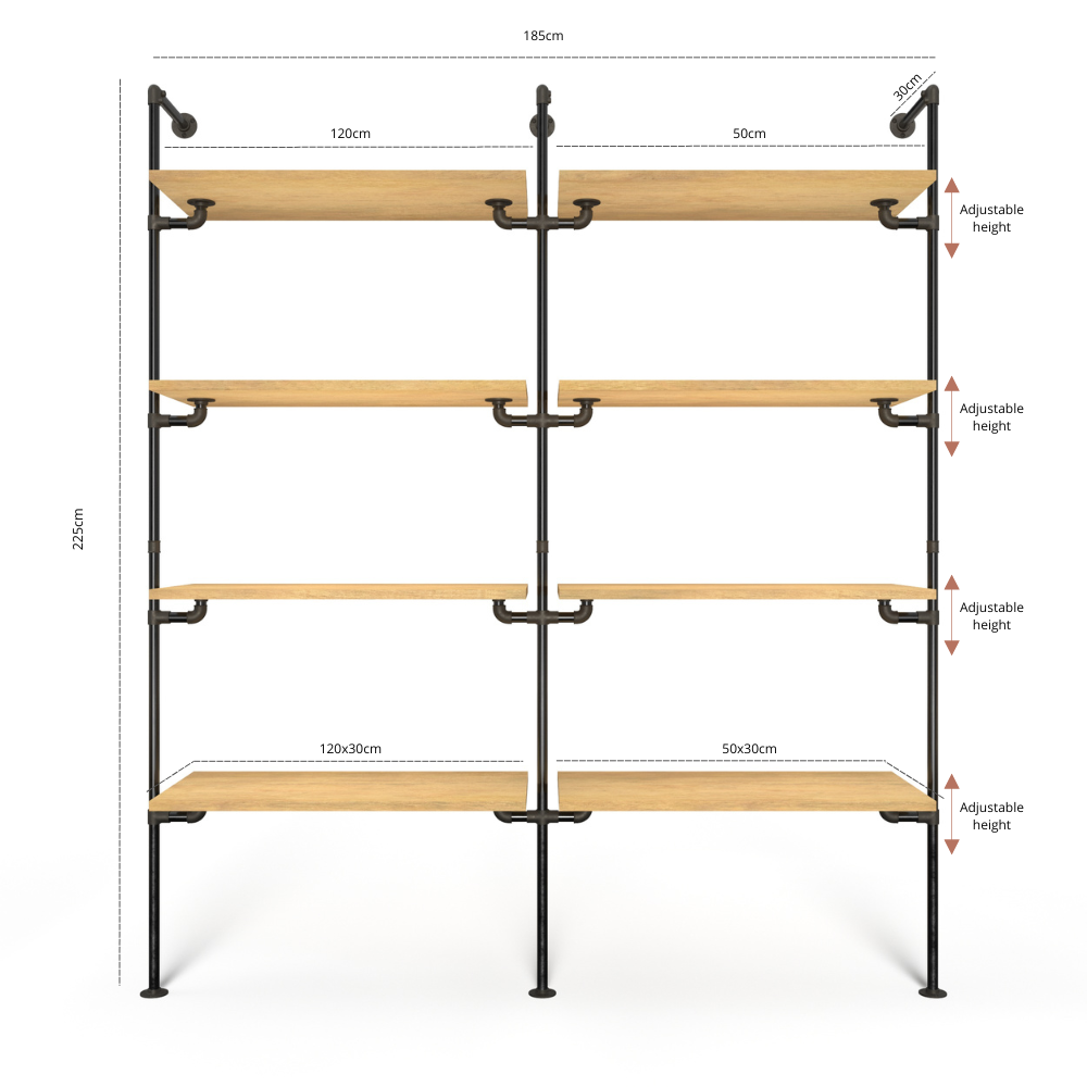 Hyldedimensioner: Dybde på 30 cm. Bredde afhænger af den valgte variant – du kan vælge sektioner på 50, 80 eller 120 cm. Bemærk, at de lodrette rør hver fylder 5 cm.