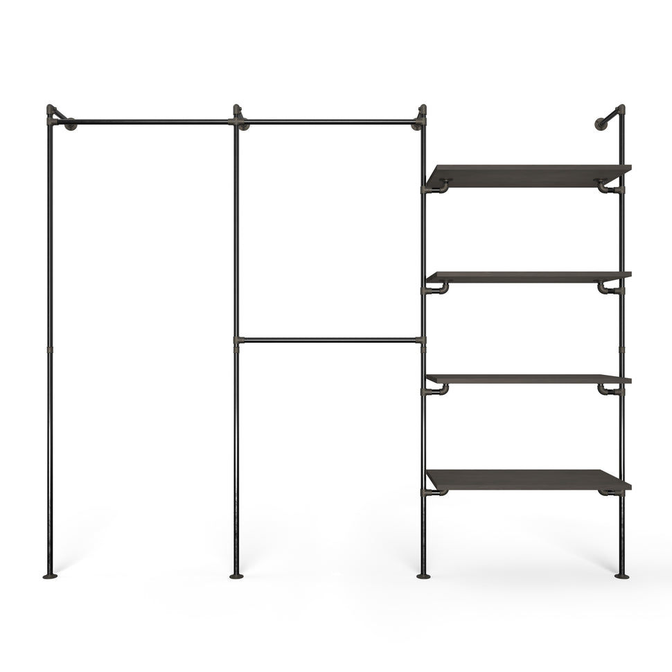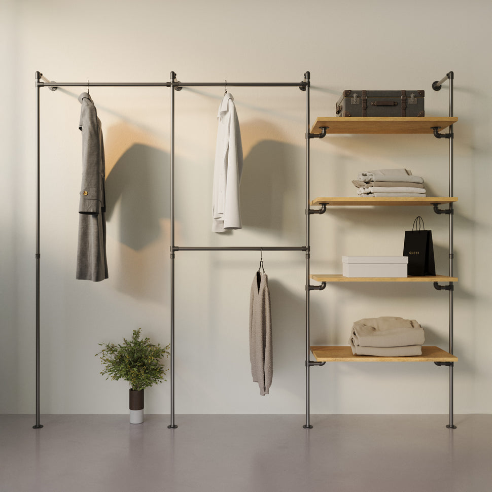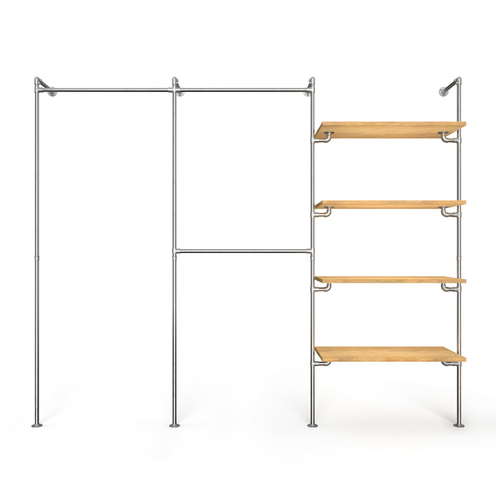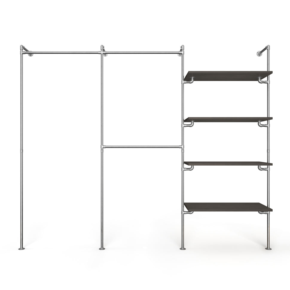 Vi tror på, at opbevaringsløsninger skal tilpasses din unikke livsstil. Med The walk-in 3 rækker reol system - (1 hæng / 2 hæng / 4 hylder) får du: