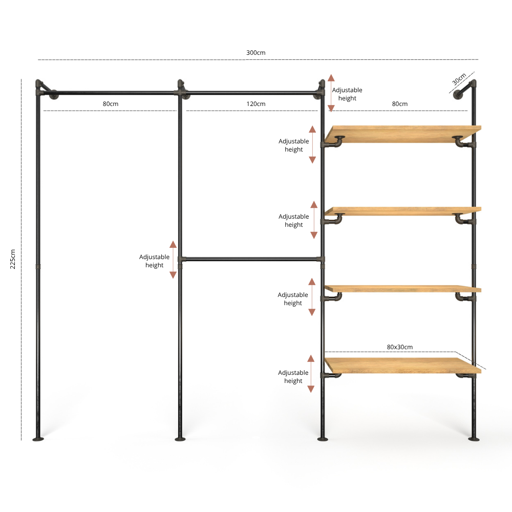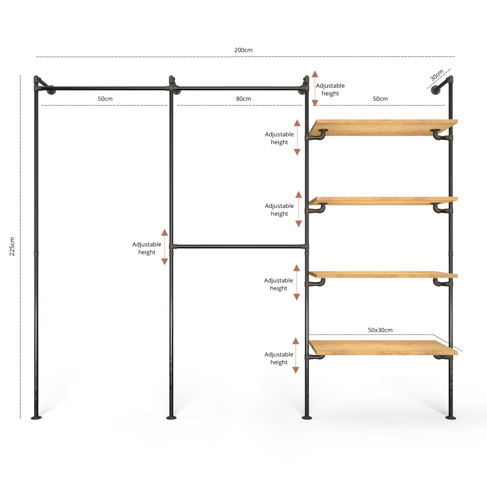 Mål: Højde på 200 cm og en dybde på 30 cm. Bredden afhænger af den valgte variant – du kan vælge sektioner med indre mål på henholdsvis 50, 80 eller 120 cm (bemærk, at de lodrette rør måler 5 cm hver).