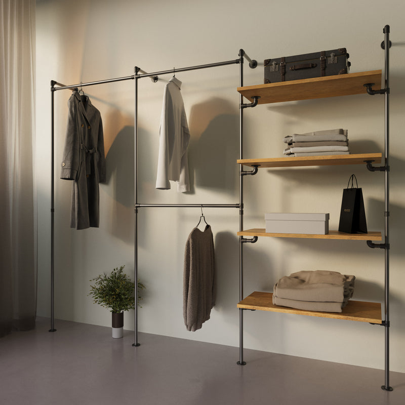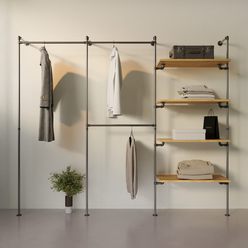 Vi ved, at en travl hverdag kræver en opbevaringsløsning, der både er funktionel og æstetisk tiltalende. Derfor præsenterer vi stolt The walk-in 3 rækker reol system - (1 hæng / 2 hæng / 4 hylder), designet til rummelige og stilfulde hjem. Vores løsning strækker grænserne for, hvad du kan opnå med din garderobe, og giver dig en skræddersyet oplevelse, uanset hvor uregelmæssigt dit rum måtte være.