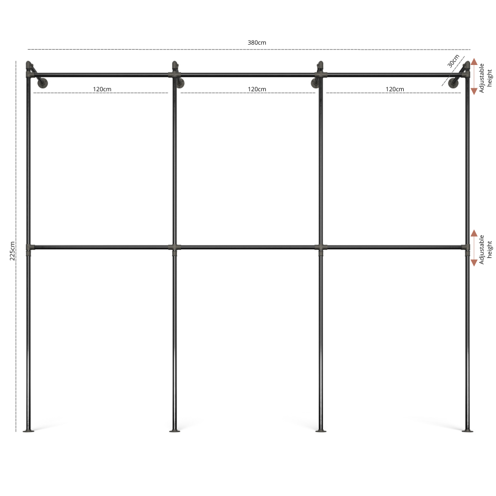 Bredde: Afhænger af, hvilken variant du vælger – mulighederne er 50, 80 eller 120 cm. Bemærk, at disse mål refererer til inderdimensionerne for bøjlestænger, hylder og kommodeelementer. De lodrette rør måler hver ca. 5 cm.