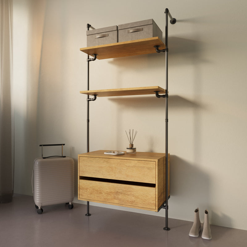 Vi forstår, at du har brug for en opbevaringsløsning, der både er funktionel, stilren og tilpasselig dine unikke behov. Derfor har vi hos RackBuddy designet The Walk-In med kommode - (2 hylder + 1 kommode) – en løsning, der strækker grænserne for traditionelle garderobesystemer og tilbyder uendelige muligheder for din opbevaring.