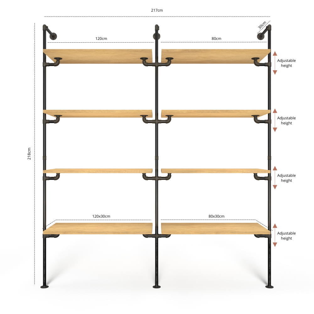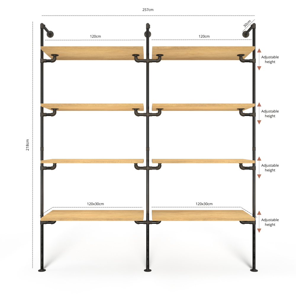 Ved at vælge The walk-in 2 rækker reol system - (4 hylder / 4 hylder) investerer du i en løsning, der tilpasser sig dit hjem over tid. Her er de centrale dimensioner: