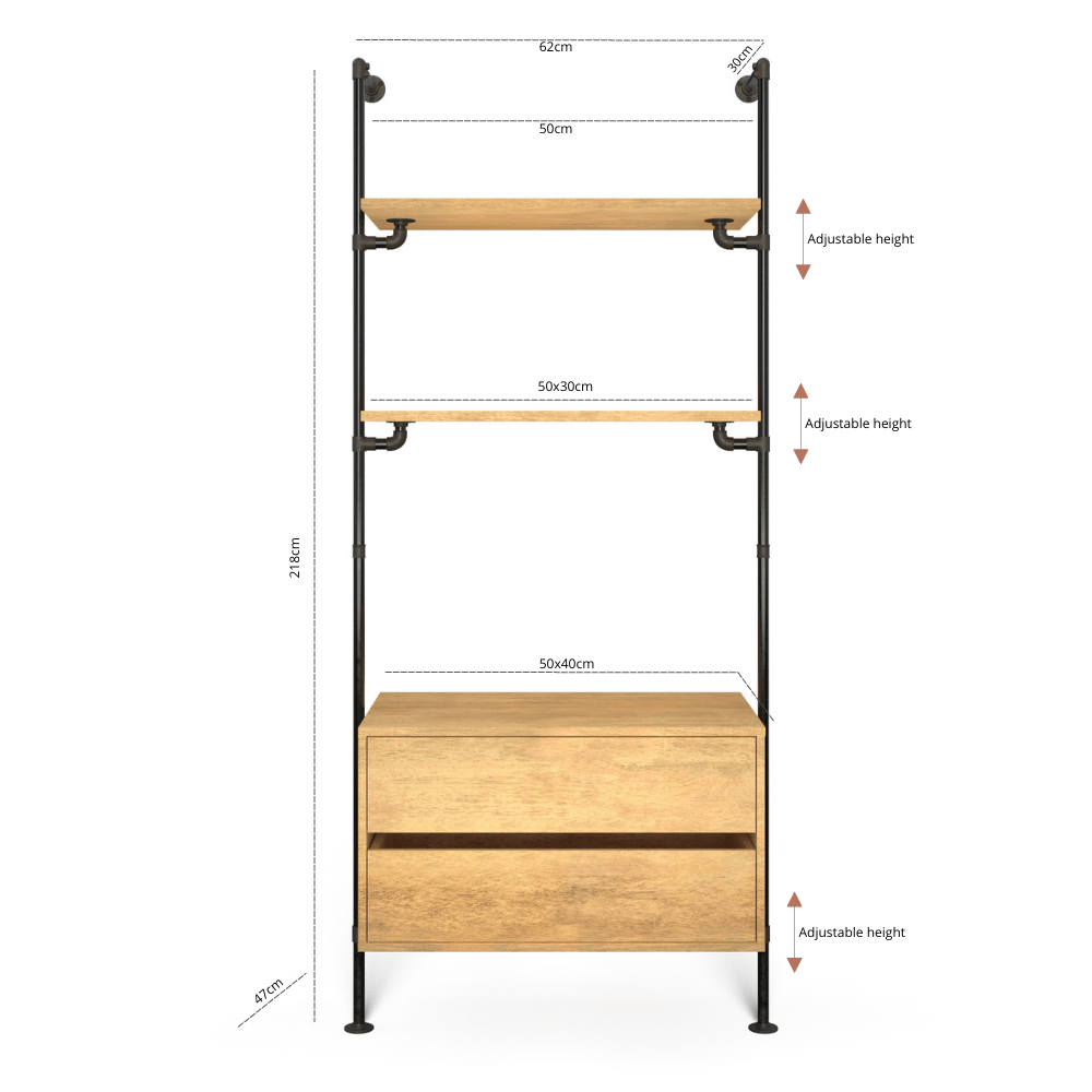 Vores løsning kombinerer to justerbare hylder og en elegant kommode, som alle kan tilpasses i højden for at matche din personlige stil og pladsens krav. Løsningen er fremstillet af holdbare materialer, hvor træ og jern mødes i en harmonisk nordisk fusion, der tilføjer et industrielt præg til dit hjem. Vores design er ikke blot æstetisk, men praktisk – vi strækker din plads, uden at gå på kompromis med kvalitet og funktionalitet.