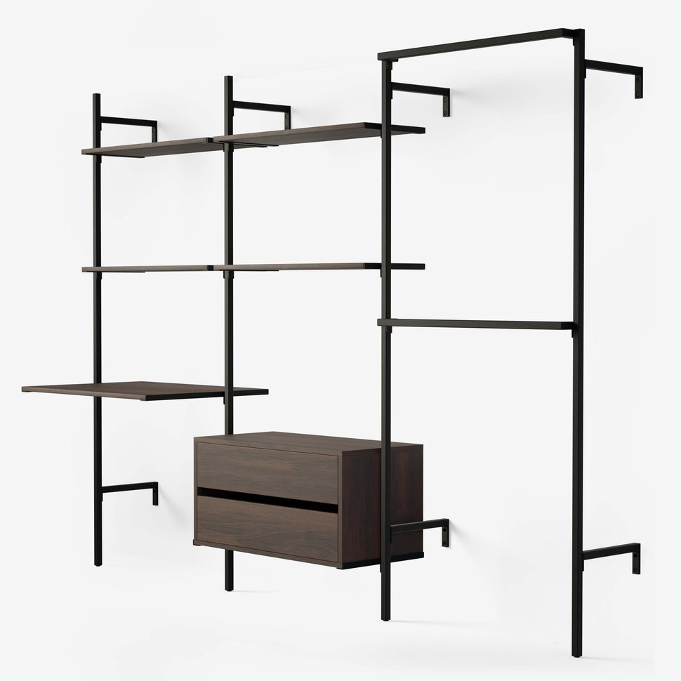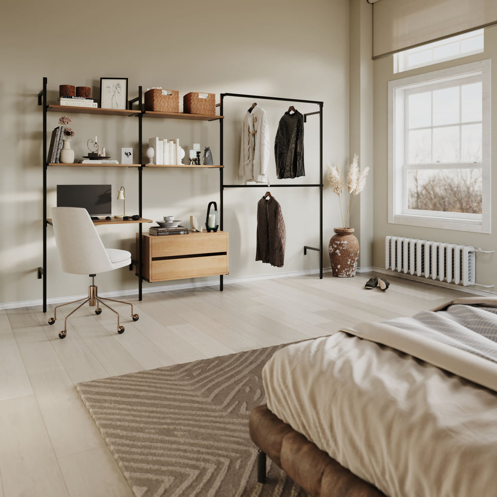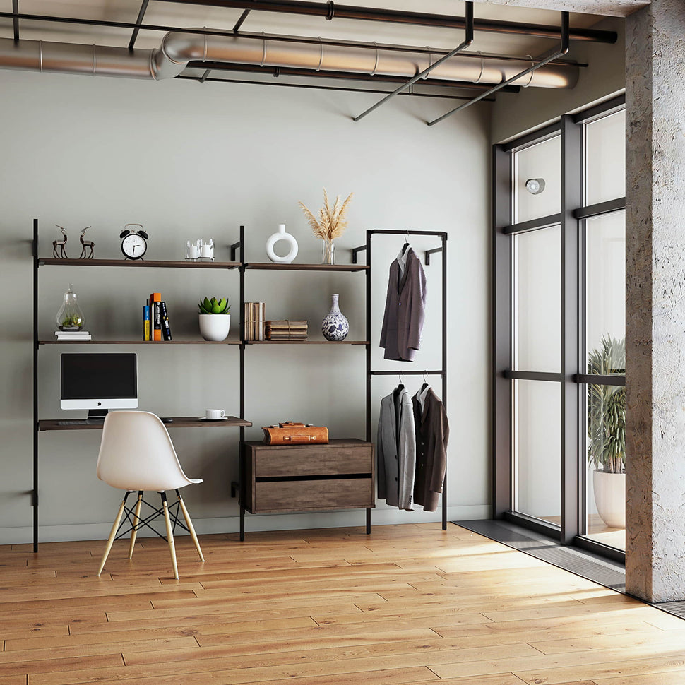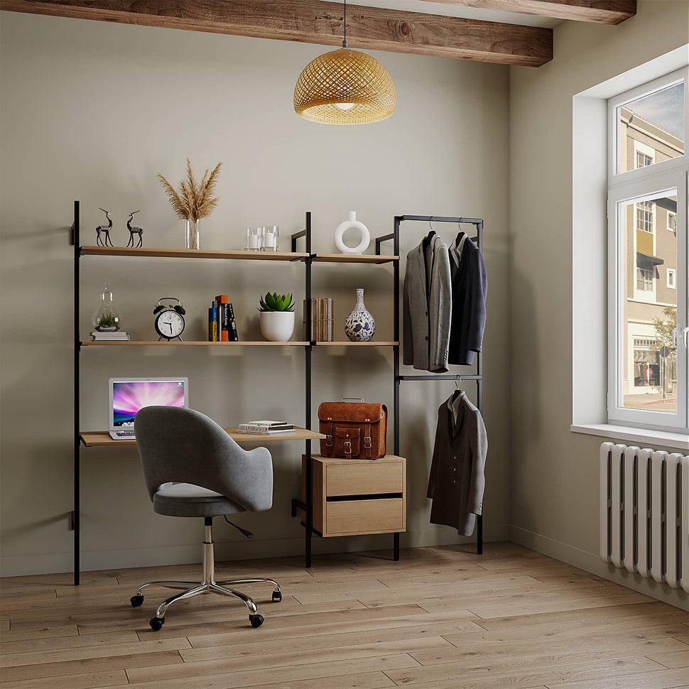 Hjemmekontor og garderobe i ét: Få plads til både kontorartikler og tøj. Det åbne design viser dine favoritter og skaber orden, så du kan nyde et velstruktureret hjem.