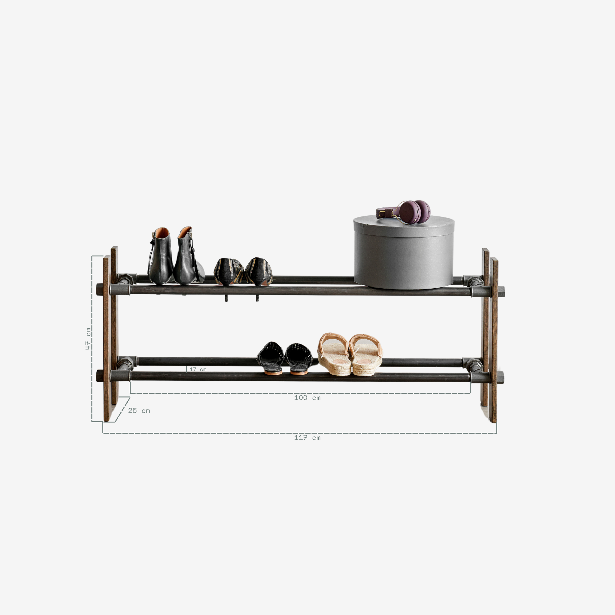 Vi har designet skoreolen med fokus på både æstetik og funktion. Den robuste ramme i olieret egetræ kombineres med klassiske vandrør, så du får et møbel der er både industrielt og naturinspireret. Vores valgmuligheder giver dig: