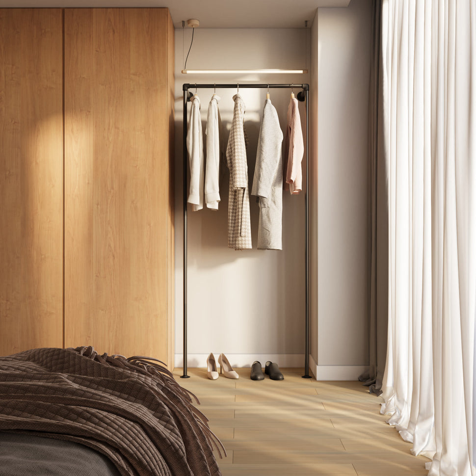 • Kompatibilitet: Kombiner med andre designs, såsom The walk-in 1 række reol system - Med hæng og 2 hylder, for at opnå ekstra hyldeplads eller flere bøjlestænger i forskellige niveauer.