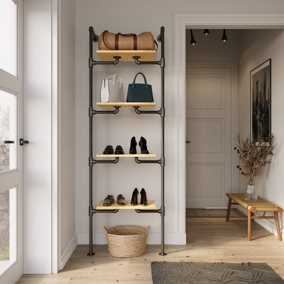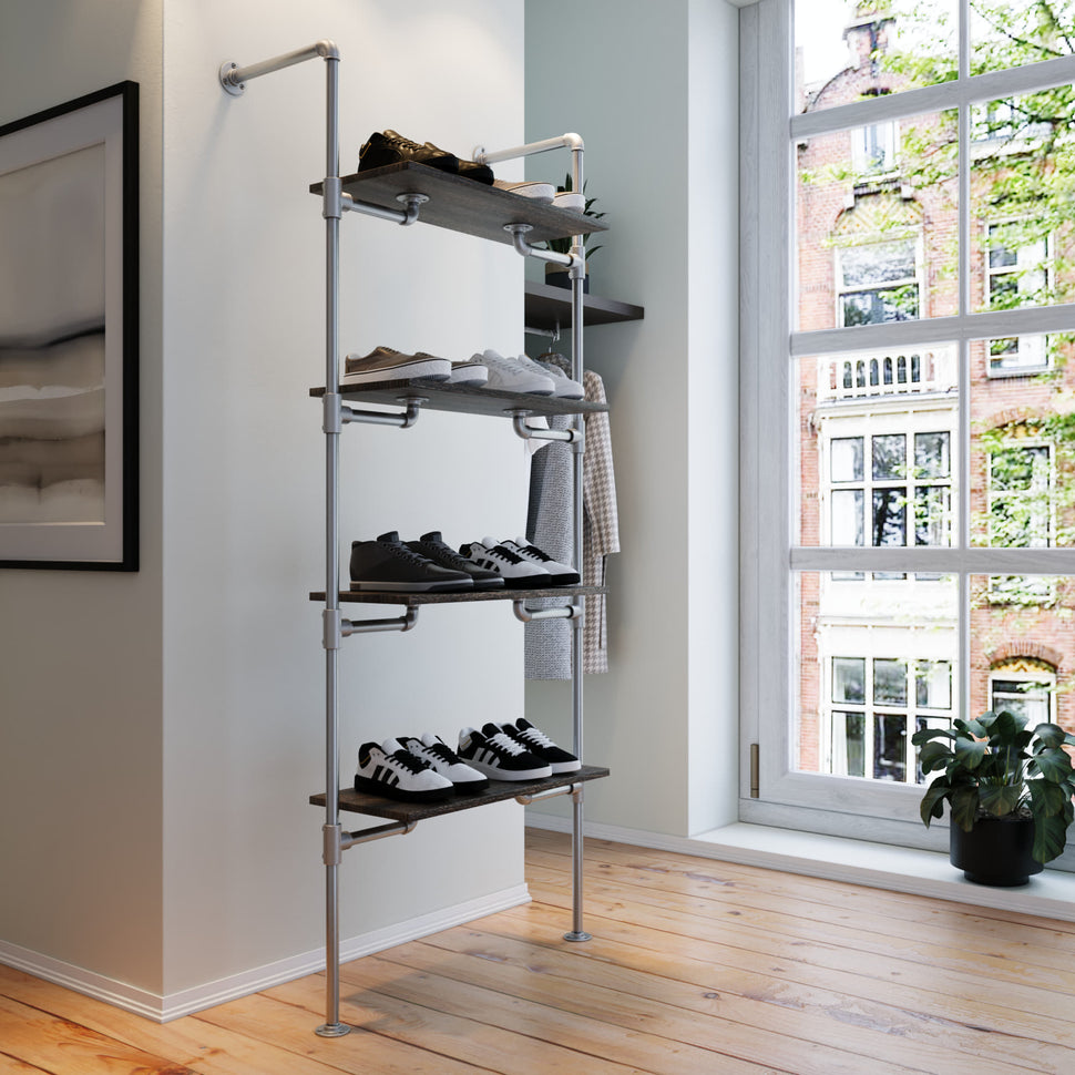 Vi hos RackBuddy forstår, at du søger en stilren og funktionel løsning, der både optimerer din plads og afspejler din personlige stil. Vores The walk-in 1 række reol system - (4 hylder) er designet til dig, der ønsker at strække dine opbevaringsmuligheder ud i enhver retning.