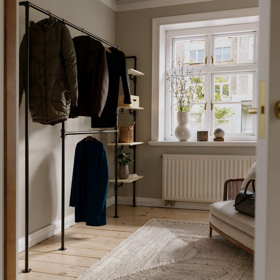 Vi tror på, at opbevaringsløsninger skal tilpasses din unikke livsstil. Med The walk-in 3 rækker reol system - (1 hæng / 2 hæng / 4 hylder) får du: