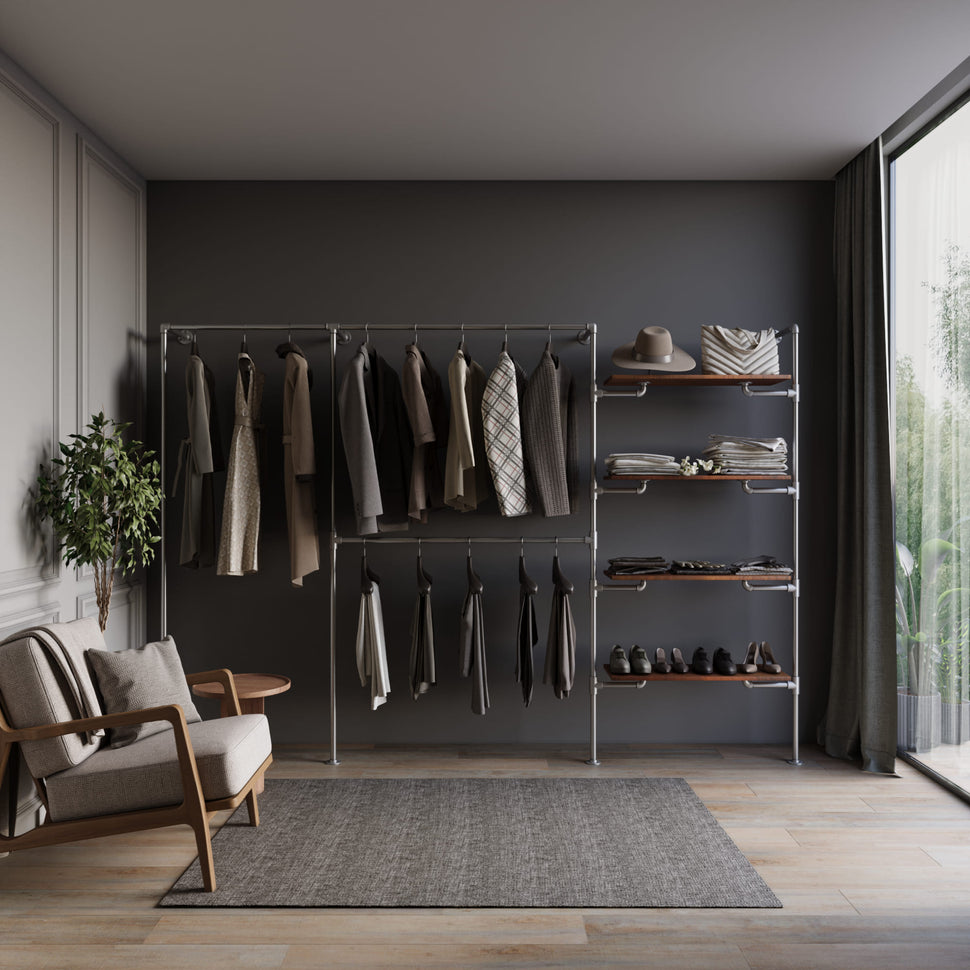 Vi ved, at en travl hverdag kræver en opbevaringsløsning, der både er funktionel og æstetisk tiltalende. Derfor præsenterer vi stolt The walk-in 3 rækker reol system - (1 hæng / 2 hæng / 4 hylder), designet til rummelige og stilfulde hjem. Vores løsning strækker grænserne for, hvad du kan opnå med din garderobe, og giver dig en skræddersyet oplevelse, uanset hvor uregelmæssigt dit rum måtte være.