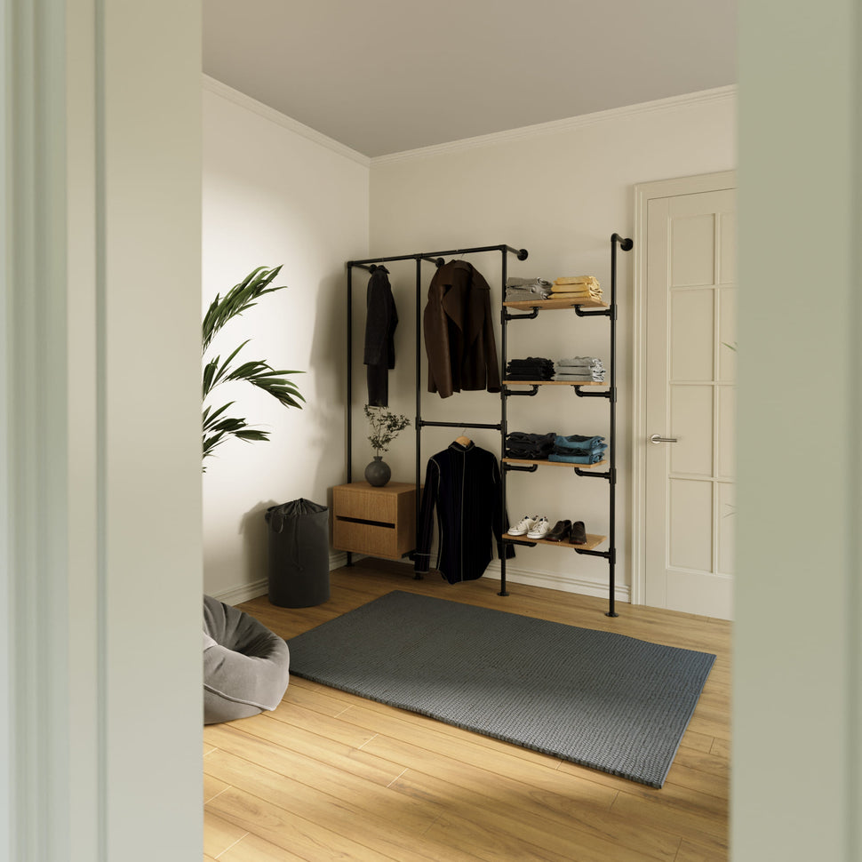 Vi forstår, at rumoptimering og personlig stil går hånd i hånd. Derfor har vi hos RackBuddy designet The Walk-In med kommode - (1 hæng + 1 kommode / 2 hæng / 4 hylder), en løsning der strækker dine opbevaringsmuligheder og skaber en stilfuld og overskuelig garderobe. Denne unikke walk-in-garderobe kombinerer funktionalitet med æstetik og sikrer, at alt fra hængende tøj til dine yndlingssko får den plads, det fortjener.
