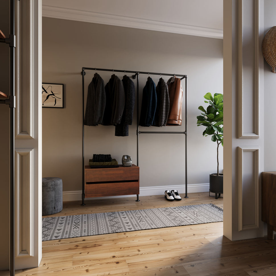 Justér, tilpas og skab et moderne og funktionelt hjem med vores The Walk-In med kommode - (1 hæng + 1 kommode / 2 hæng). Vis os din udfordring, og vi fixer det – det eneste, der begrænser dig, er din fantasi.