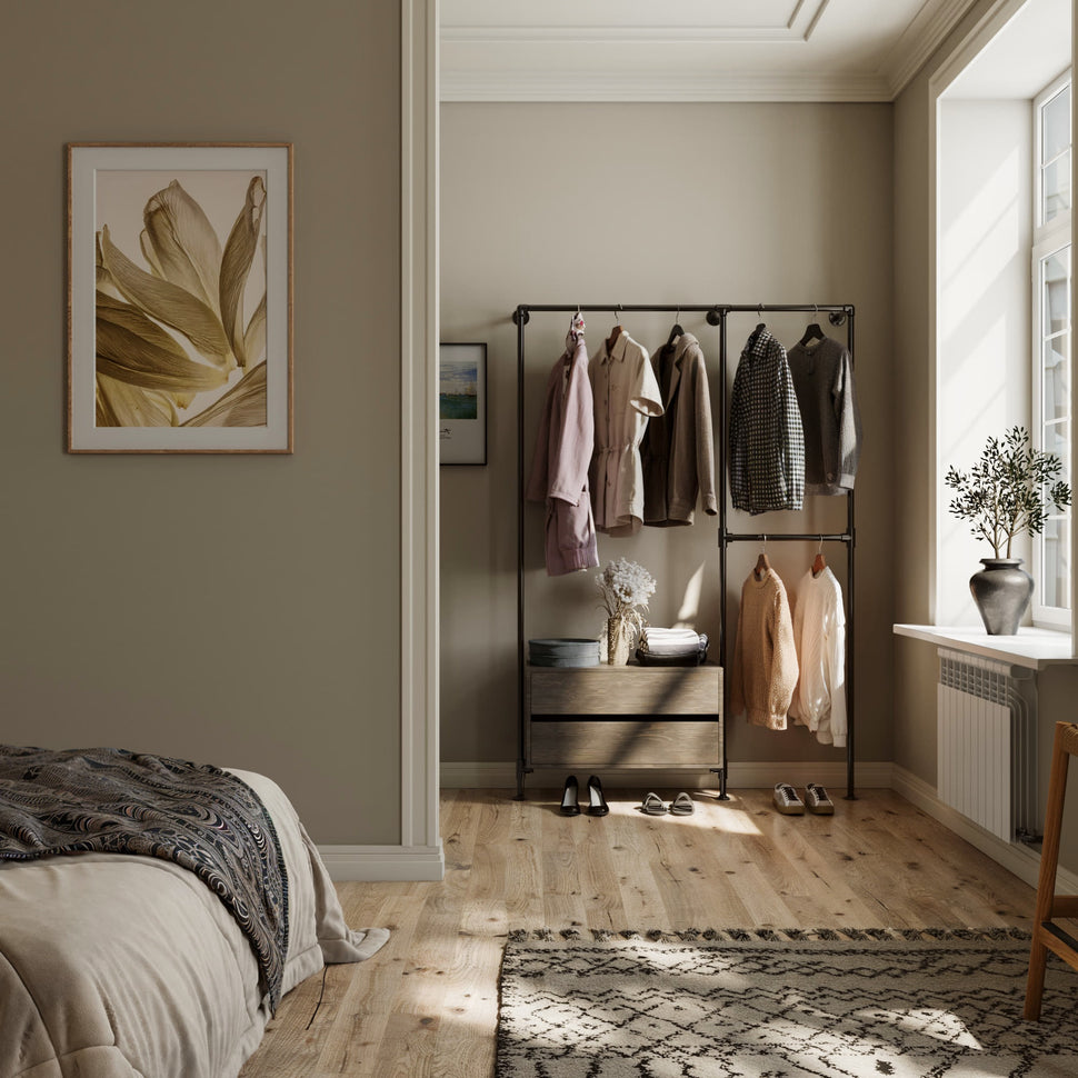 Med vores The Walk-In med kommode - (1 hæng + 1 kommode / 2 hæng) opnår du en kombination af æstetik og funktionalitet. Vi har valgt få nøje udvalgte komponenter, der udvider dine opbevaringsmuligheder og skaber en garderobe, som både inspirerer og organiserer din hverdag. Vores design gør det muligt at skabe et personligt, velstruktureret hjem med: