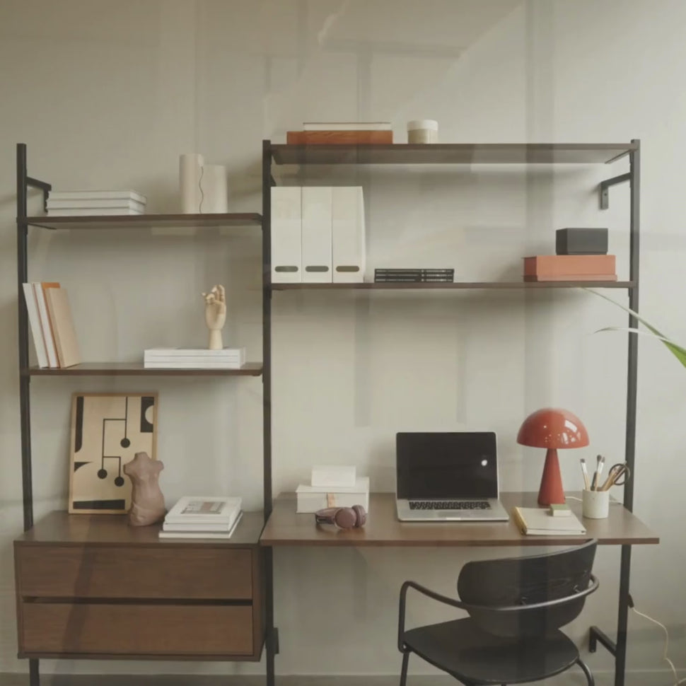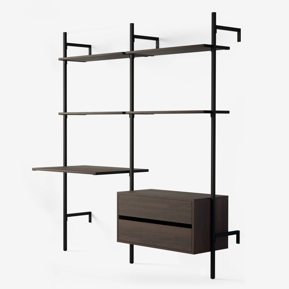 Vores løsning kombinerer to rækker, der let kan tilpasses til dit hjemmekontor eller walk-in closet. Med et åbent system, der byder på: