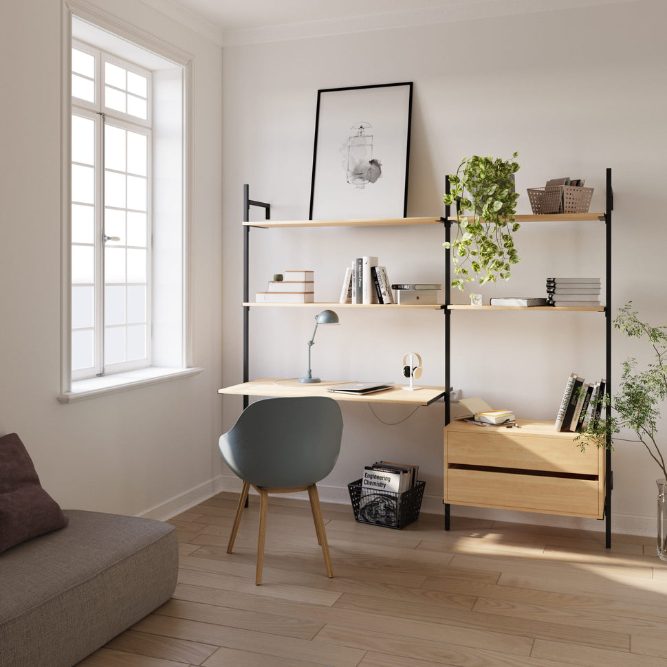 2 hylder + 1 skrivebord: Højdejusterbare træhylder samt et funktionelt skrivebord, der muliggør en overskuelig arbejdsplads.